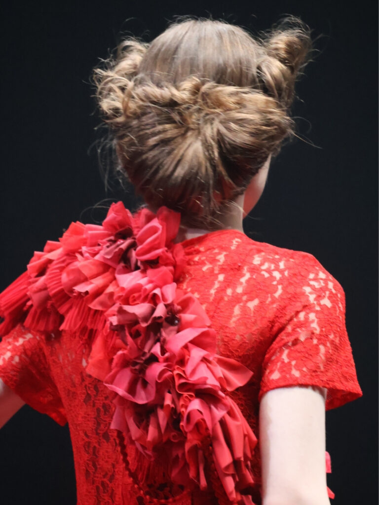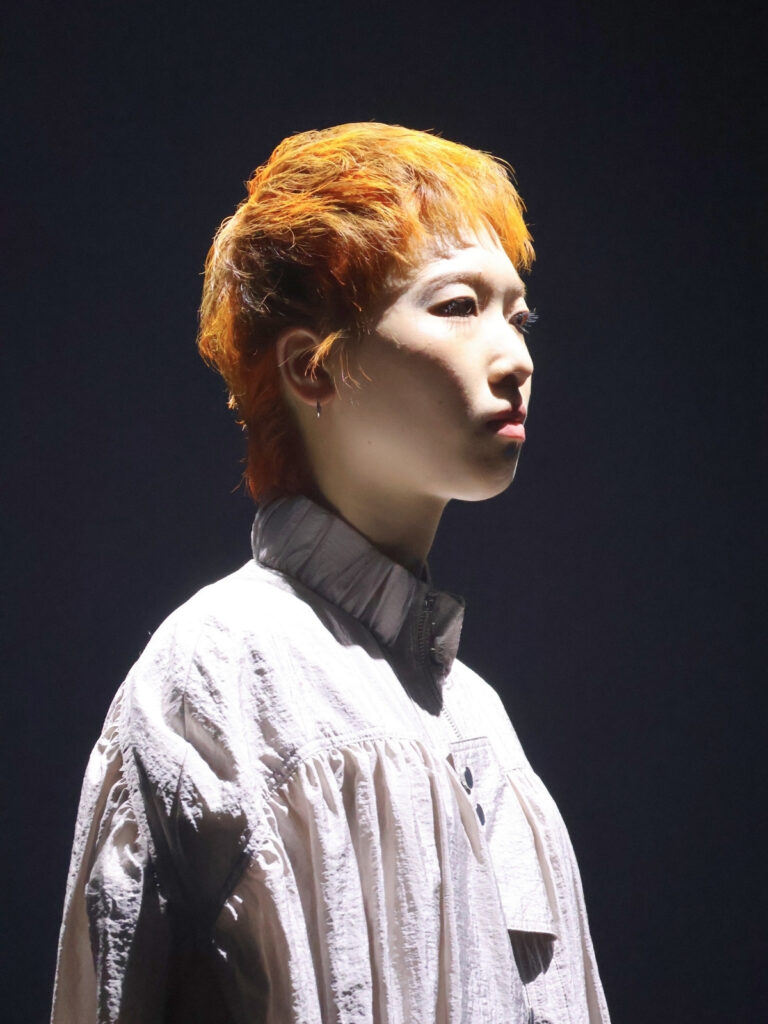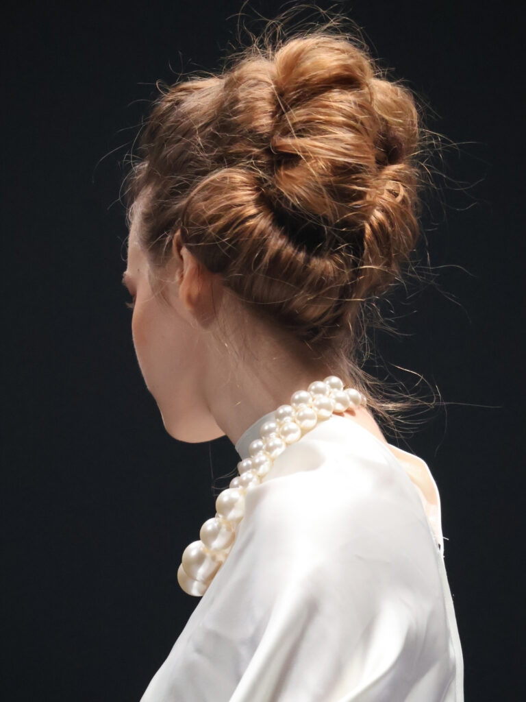 セットステージでは「クラシックに潜む違和感」をテーマに、ボリュームのあるアップスタイルを披露。空気を含ませるような繊細な手さばきで、重厚さと軽やかさを共存させた。