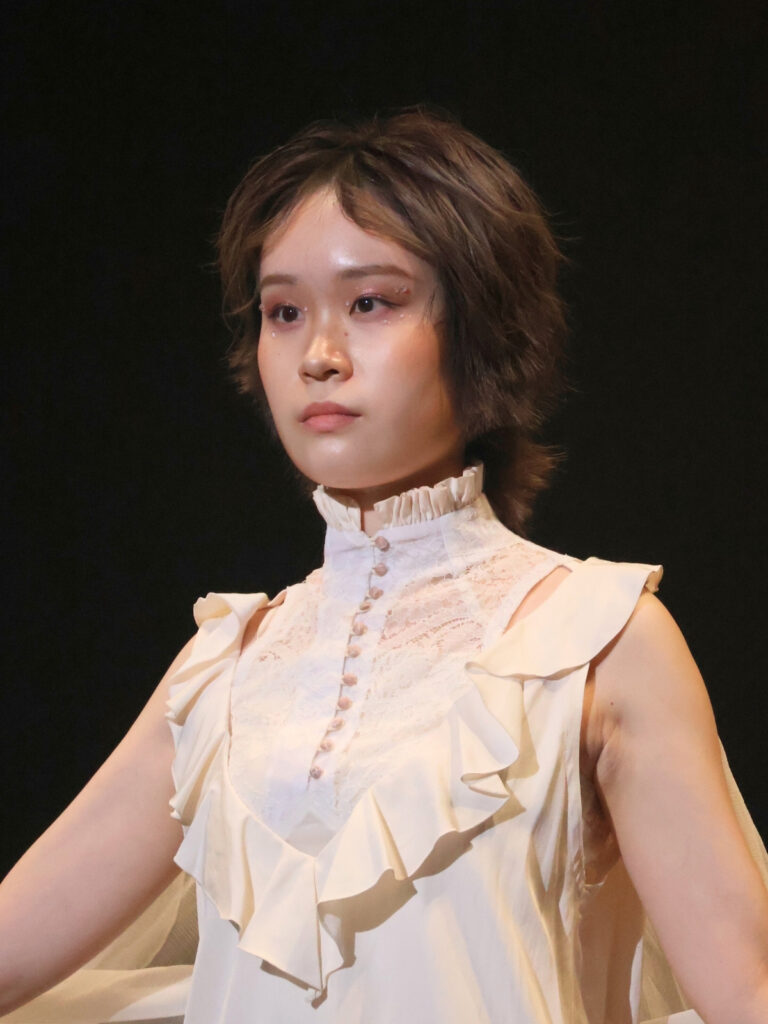 ファッションステージでは、フェミニンでロマンチックな衣装にデザインカラーを合わせたモデルが登場。柔らかなオレンジのショートヘアをバリカンでサイドを刈り上げ、都会的に仕上げた。衣装はファッションデザイナーのアオイ ワナカ(AOI WANAKA)とコラボレーションした。
