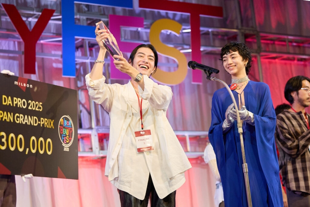 「DA PRO」のグランプリは「STRAMA(ストラマ)」春宮雅之さんが獲得。「STRAMAに入社して10年。美容業界で戦っていくためには努力しかない。これからも若手のクリエーションを盛り上げるため、デザインし続けたい」と涙ぐみながら喜びを語った。
