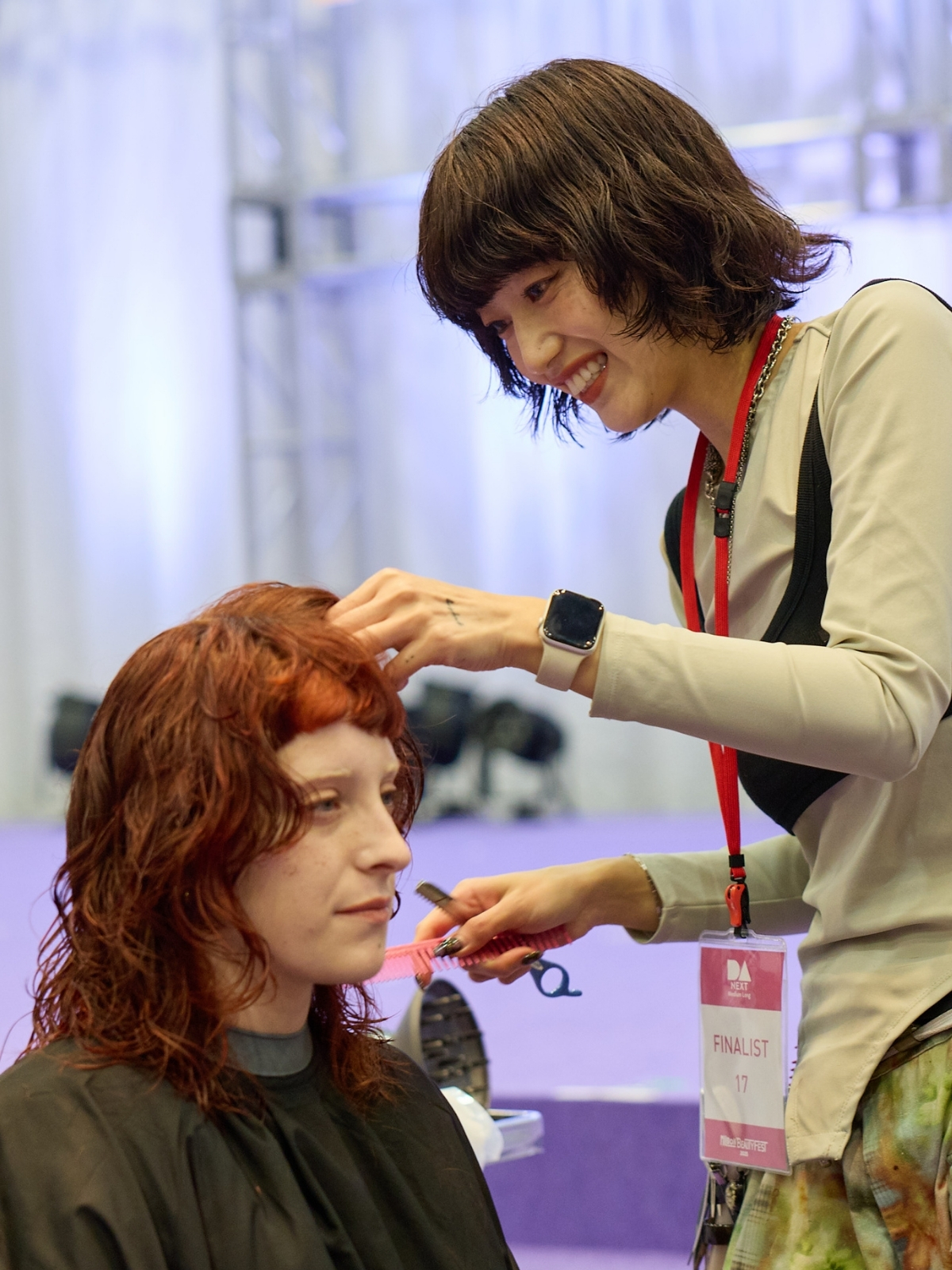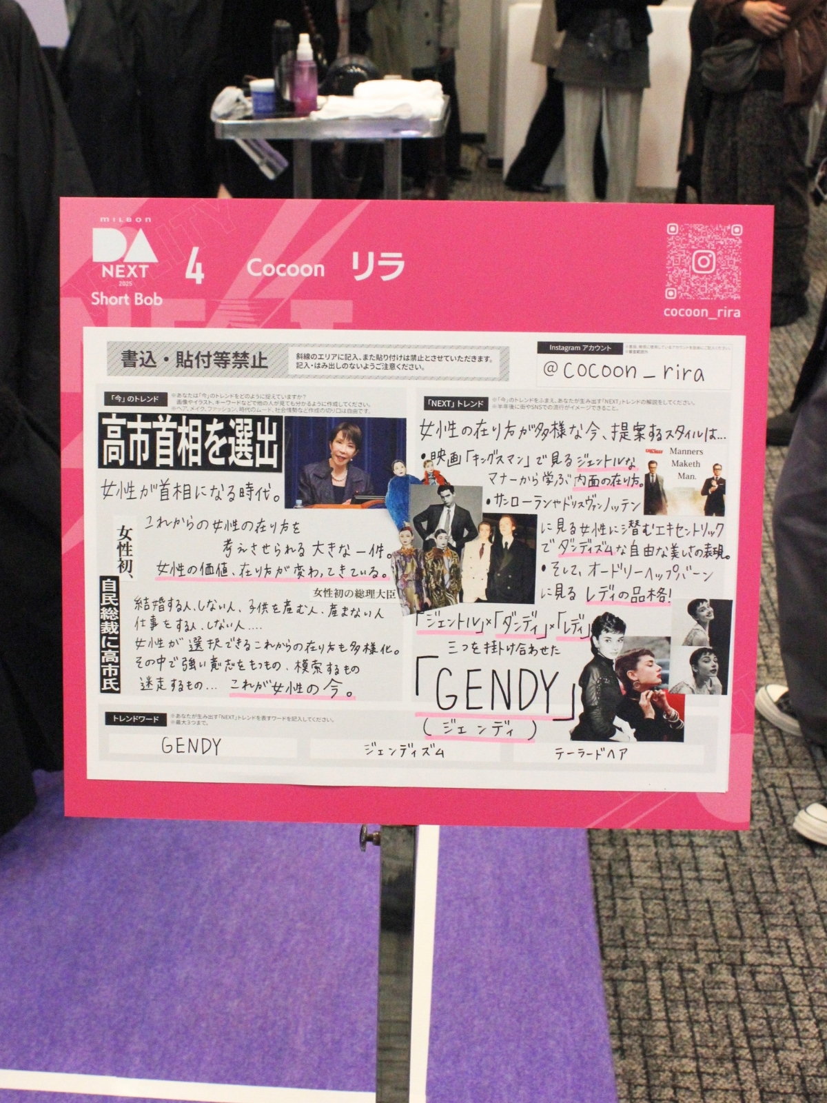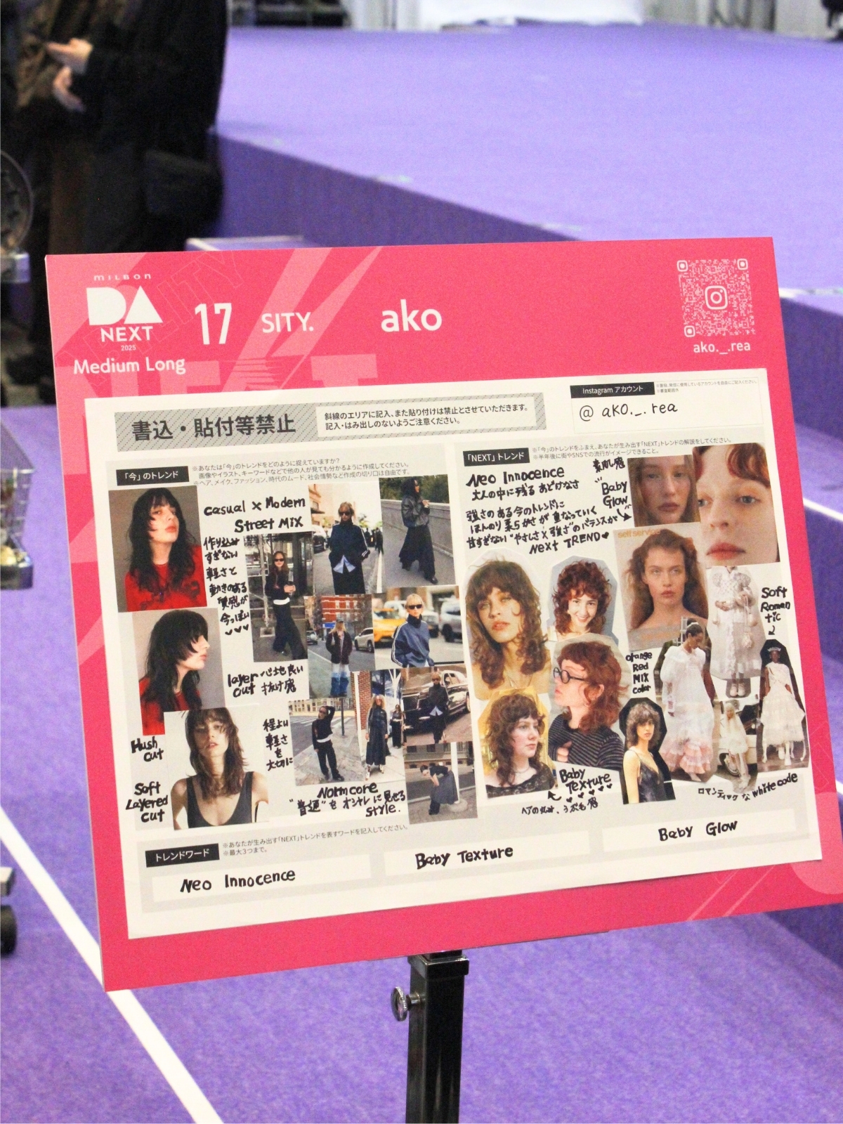 30歳以下対象。「今」と「ネクスト」のトレンドを書き込んだシートも含め、スタイリング後にモデルをスマホで撮影し、そのビジュアルも含めて審査対象とするて審査する。ショート・ボブとミディアム・ロングの2部門で腕を競い、各エリアの予選を勝ち抜いた9名が腕を競った。