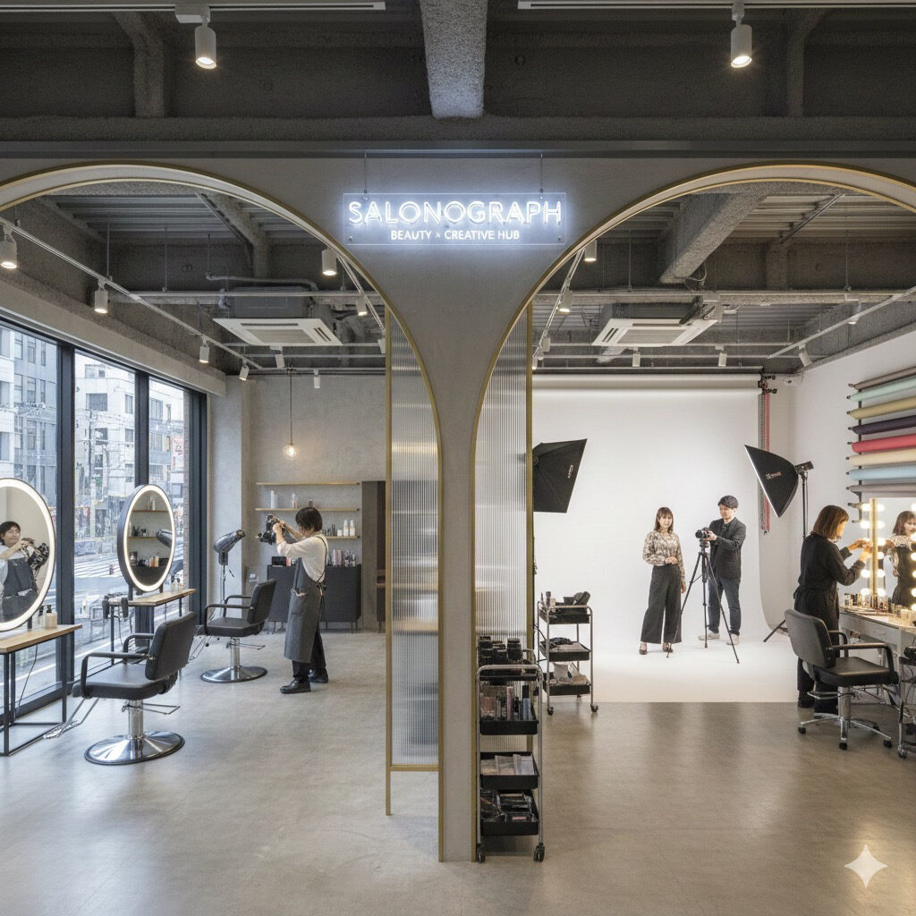 「salongraph」はヘアサロンに撮影スタジオを併設し、国家資格を持つヘアメイクが常駐する点が特徴。広告撮影やSNS・EC向けコンテンツ制作、プロフィール撮影などに対応する。一般個人向けの撮影利用も想定する。