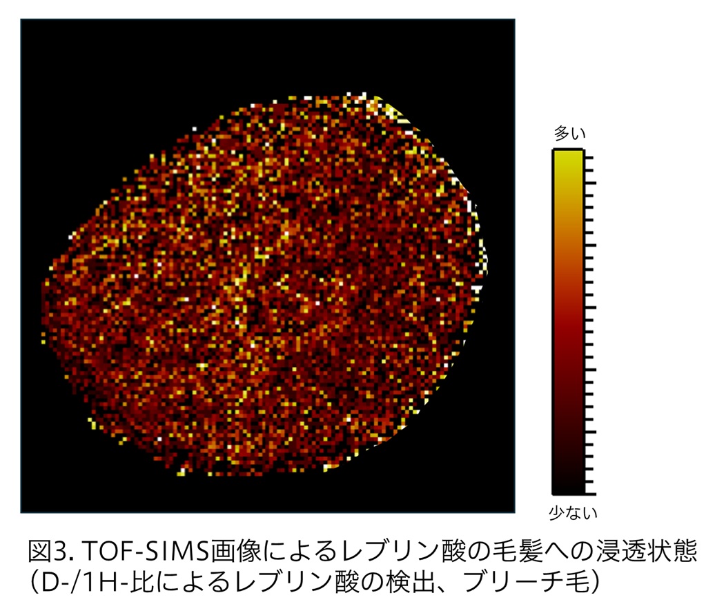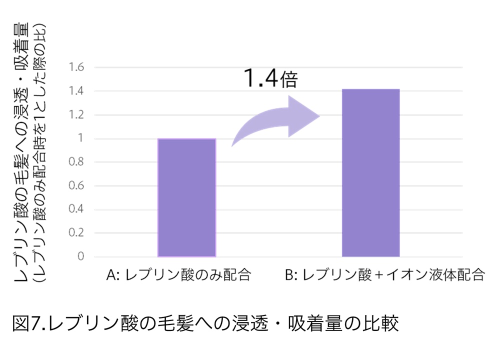 加えて、レブリン酸とイオン液体(オレイン酸とトロメタミンからなる複合塩)を併用した場合、レブリン酸単独と比べて毛髪への浸透量および吸着量が増加し、約1.4倍となることを確認した。イオン液体がレブリン酸の毛髪内部への浸透を促進したとみられる。