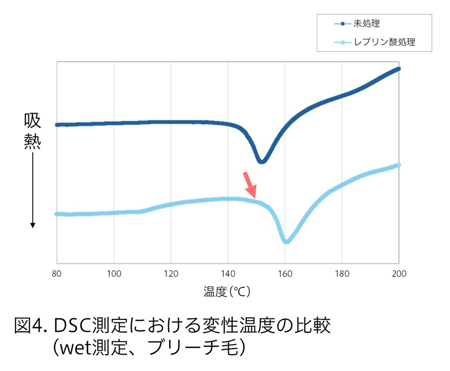 同社の研究では、化学処理履歴のない毛髪にヘアアイロン処理を行うと、未処理毛と比べて破断強度が有意に低下することを確認。また、示差走査熱量測定(DSC測定)により、毛髪内部構造が変化する温度帯(変性温度)が低下することが分かった。これは、熱処理によって毛髪内部の架橋密度が低下し、内部構造が緩むことを示唆しているという。