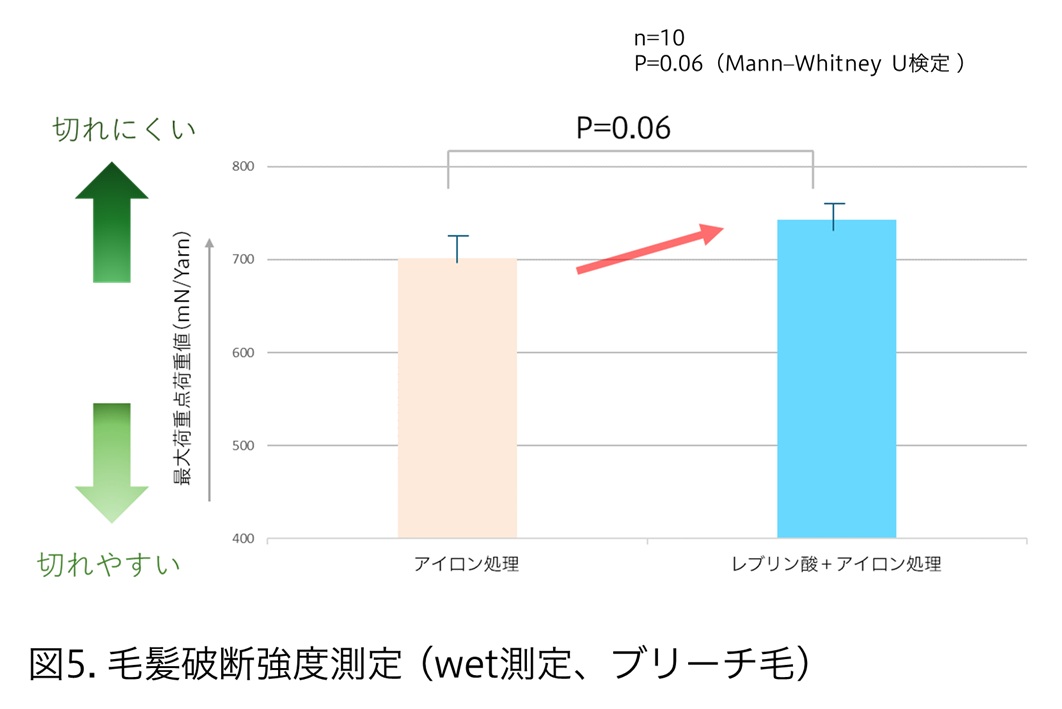 一方、レブリン酸を処理した毛髪では、DSC測定において変性温度が高くなることを確認。さらに、レブリン酸処理後にヘアアイロン処理を行った毛髪は、ヘアアイロン処理のみを行った毛髪と比べ、破断強度が上昇することが分かった。マンダムは、レブリン酸が毛髪内部に浸透し、内部構造の架橋密度を高めることで、熱に対して強い状態へ変化した可能性があるとしている。