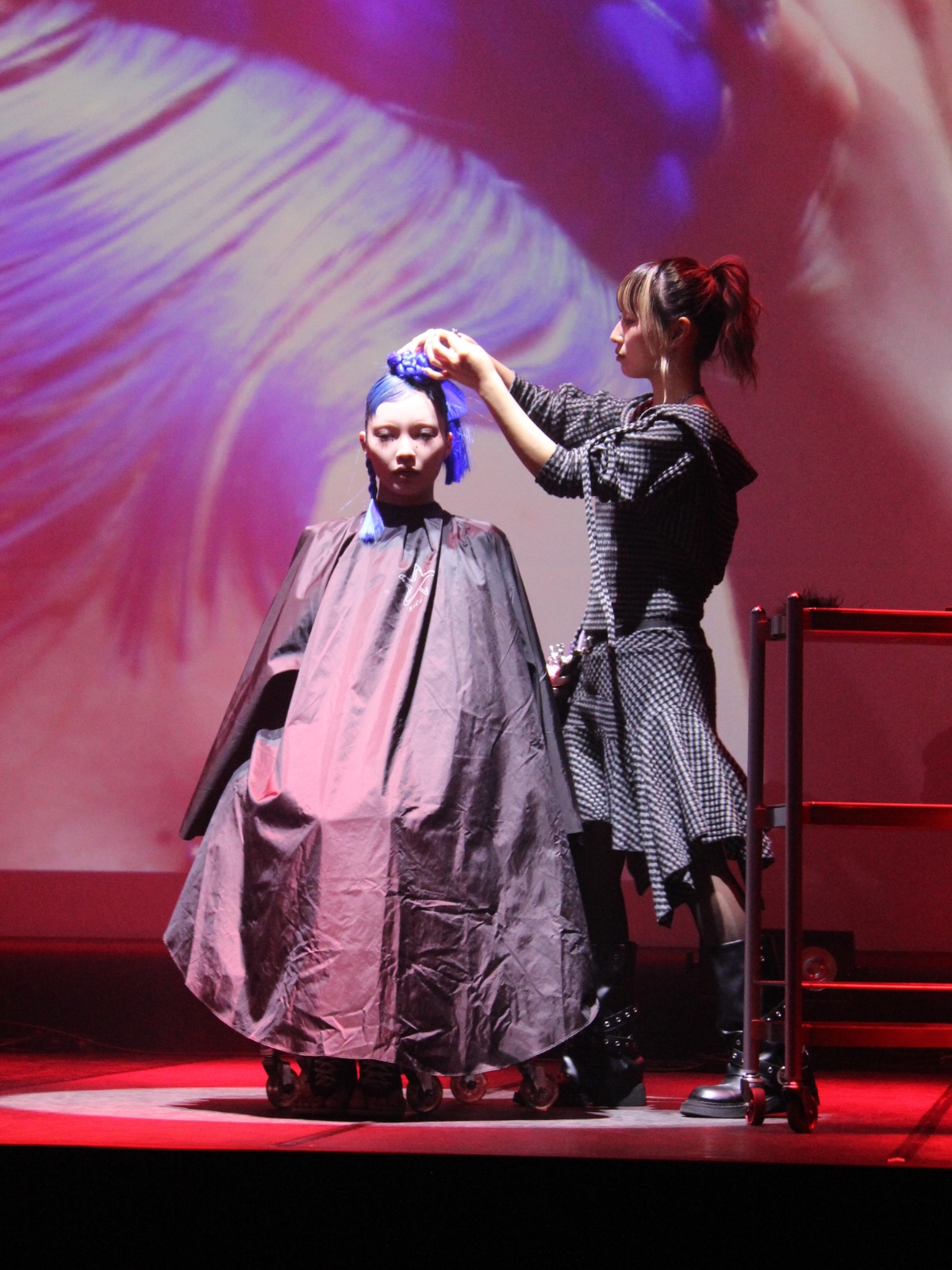 いずれもキャリア5年目以下の若手スタイリストが出演し、就職ガイダンスでの説明に加え、ヘアショーのステージも担当。努力次第で自分たちも到達できる場所というメッセージを技術と演出を通して学生たちへ伝えた。