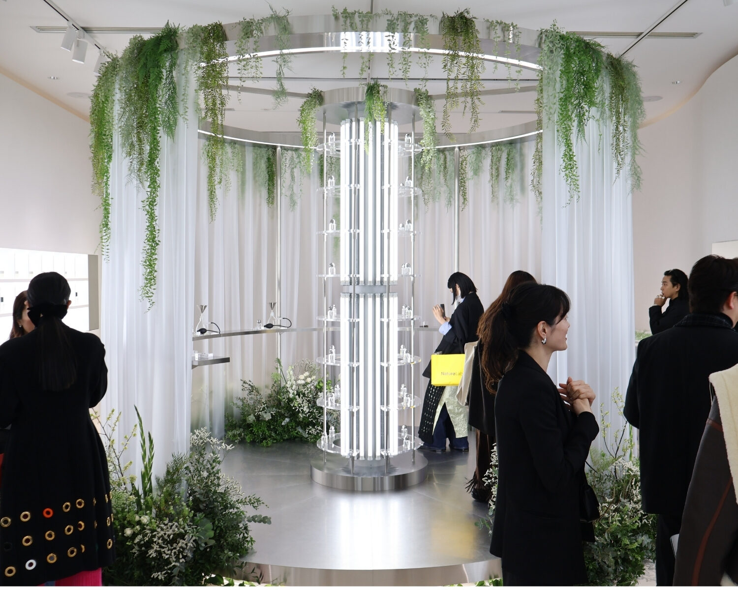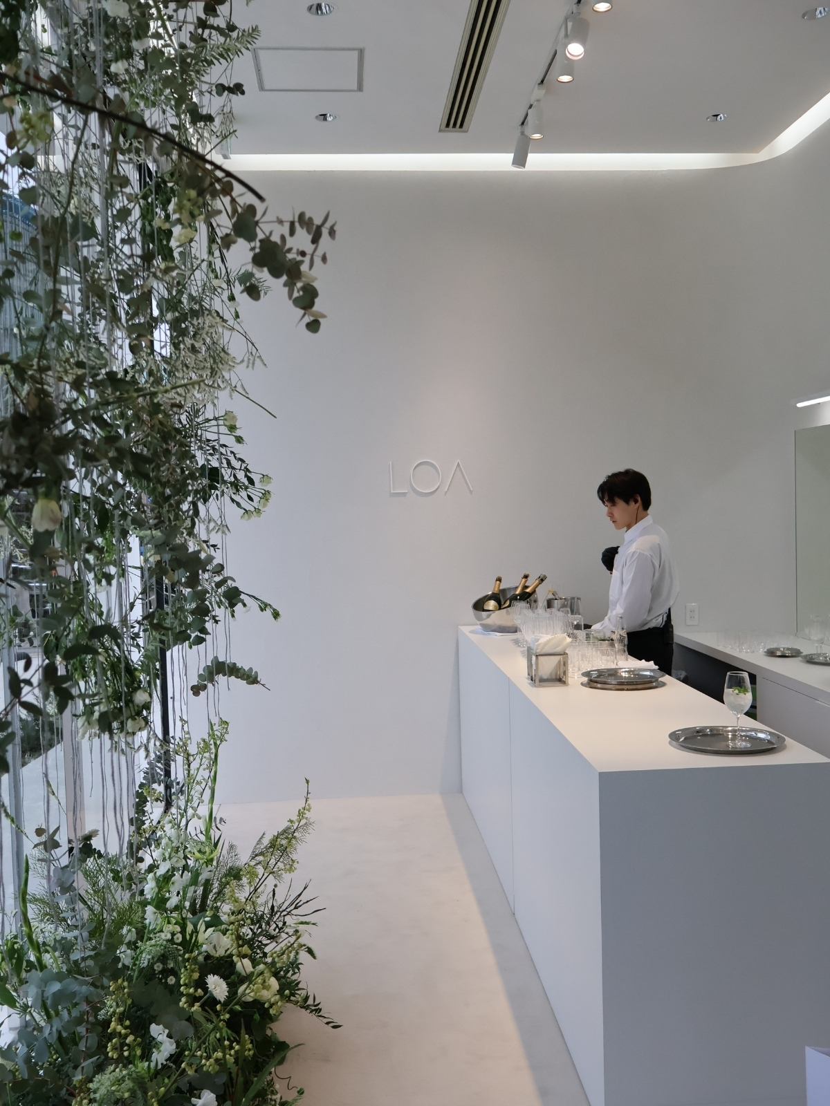 会場は白とグリーンを基調とし、中央のテイスティングスペースでは全11種類の香りを体験できる。2月12日に発売した「ロア オードパルファム(LOA EAU DE PARFUM)」もフルラインで展開し、購入者にはボトルへのイニシャル刻印サービスを用意する。商品購入者には数量限定で、香りと呼応するフラワーギフトを進呈する。
