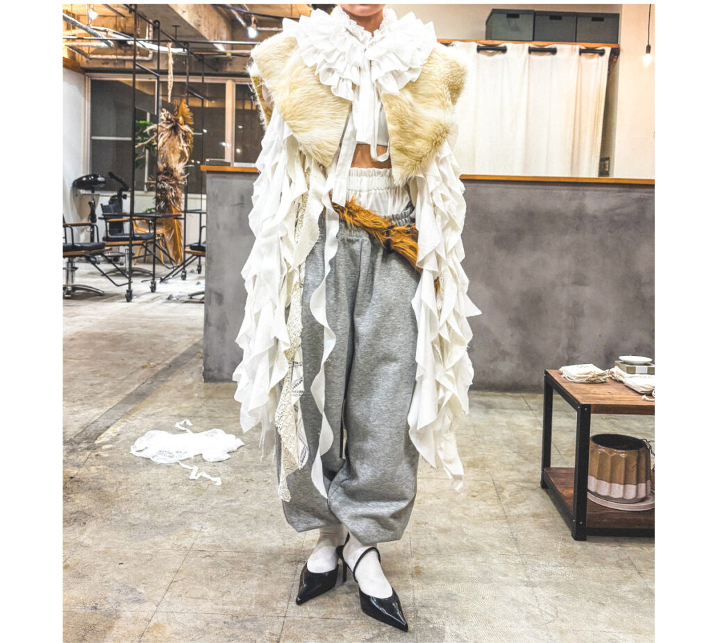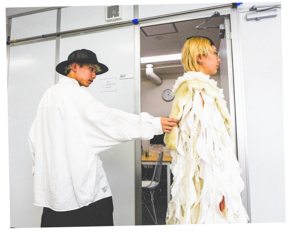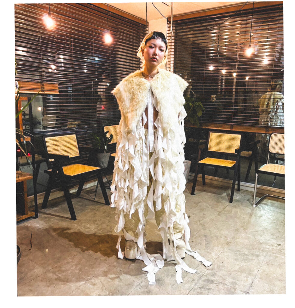 「最初はウェディングドレスがイメージだったんですけど、ドレスは審査で好みが分かれると思ってやめたんです。そこから毛足の長いファーに目をつけて、コレクション誌を読み漁るなかで「ANN DEMEULEMEESTER」(2025-26年秋冬コレクション)のあるルックが目に止まって。方向性が定まっていきました」