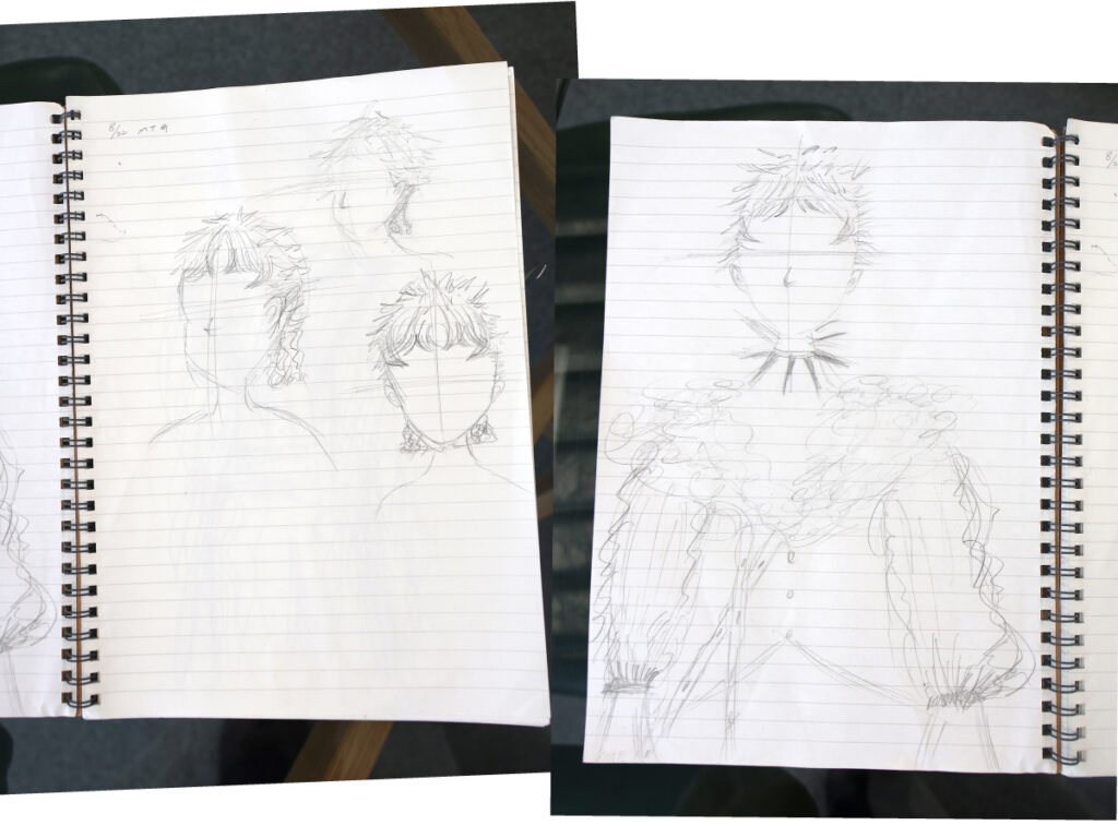 イメージを練る途中で描いたヘアと衣装のデッサン