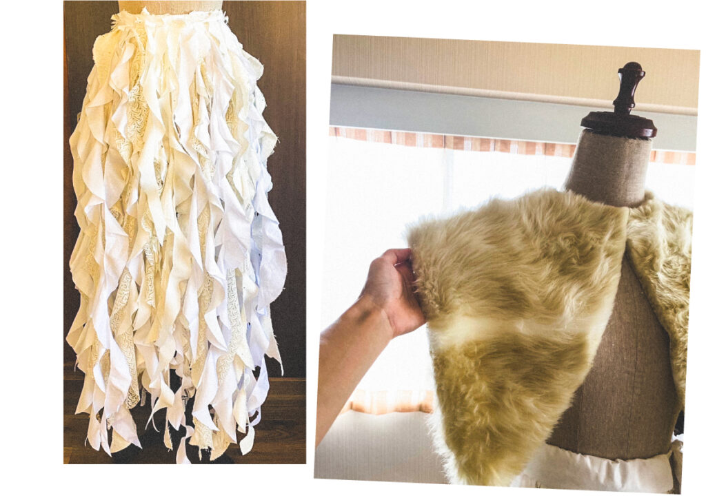 8月27日に上がった最初の衣装案。細長く裁った白い布を重ねて縫い付けたスカートに、肩にボリュームのあるファー素材を合わせ、冬らしい重厚さと神話的な存在感を演出した。