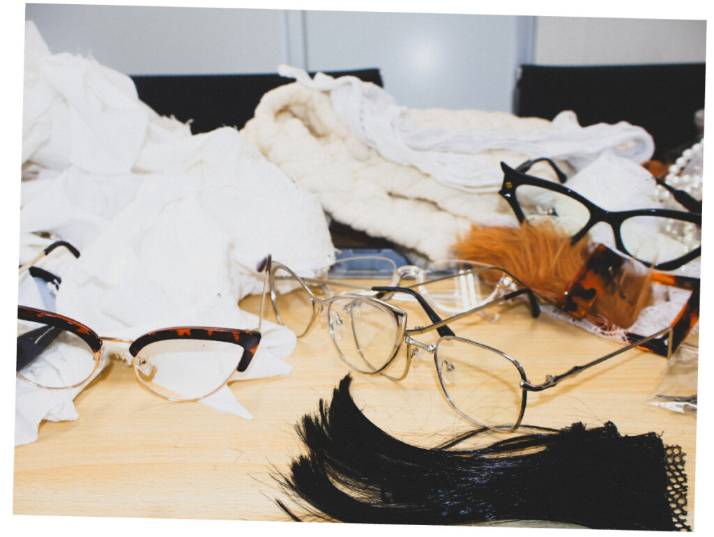 細かい衣装パーツをひとつずつ組み合わせ、最適なバランスを探る。撮影でいつも使っているメガネもいくつか試した。