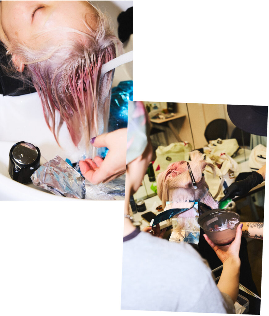 根元と毛先にピンクをオン。毛先は当日のカットラインを想像しながら、根元より薄く色を入れていく