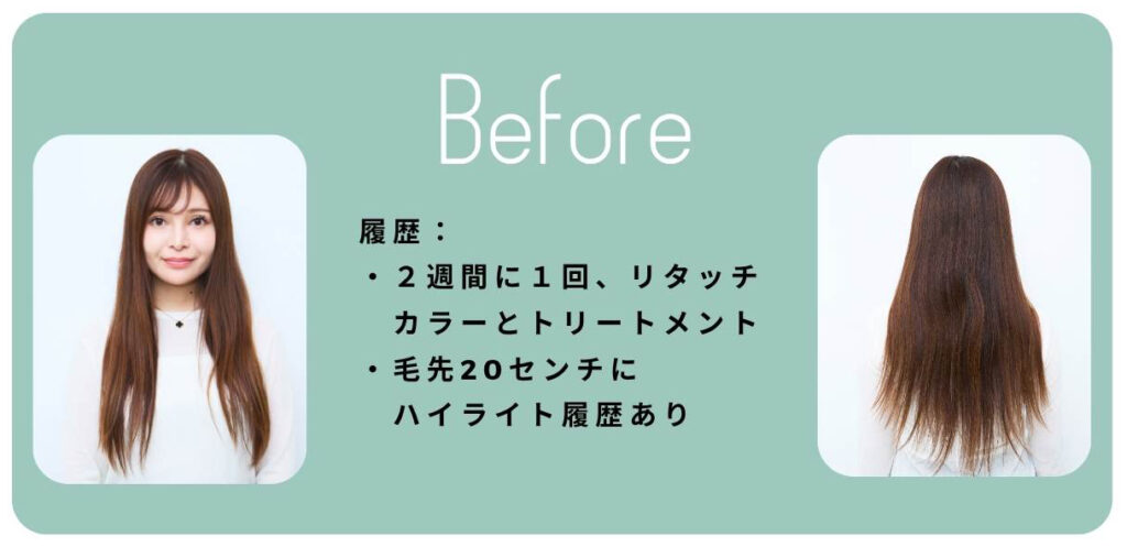 今回のモデルさんは4年間担当していて、2週間に1回来店してくれているお客さま。linkの周期的な40分のケアでここまで髪は美しくなります。