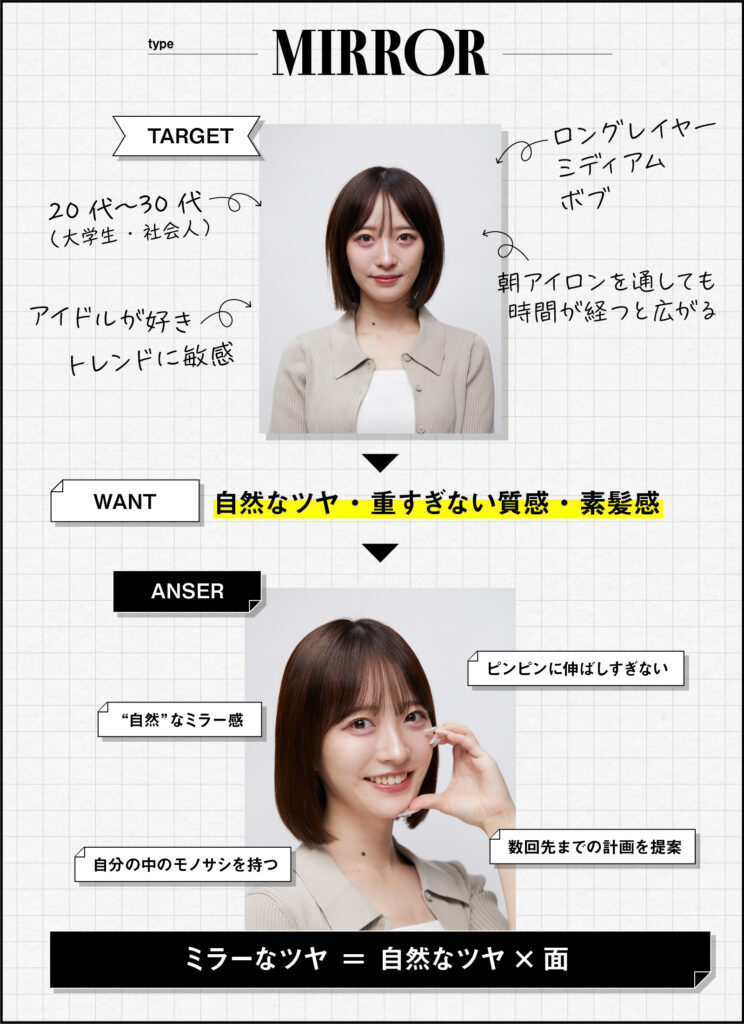 けれども、カラー毛やストレート履歴のある髪への「不自然なツヤ」は髪に負担をかけてしまう場合も。インスタグラムで日々流れてくる「ツヤツヤ」「さらさら」のミラーの質感は、撮影の瞬間はキレイでも、本当にお客さまの未来の髪のためになっているか。これを僕たち美容師は今一度考えるときなのかもしれません。