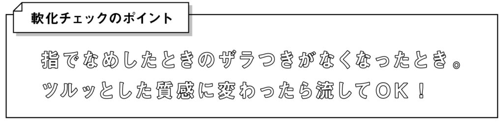 塗布し始めてから約20分で流しますが、先にタイムを決めるのではなく、流せる状態になったときに流すことが大切です。時間管理以上に、軟化チェックを行う際に自分の中でモノサシを持つことを意識しています。