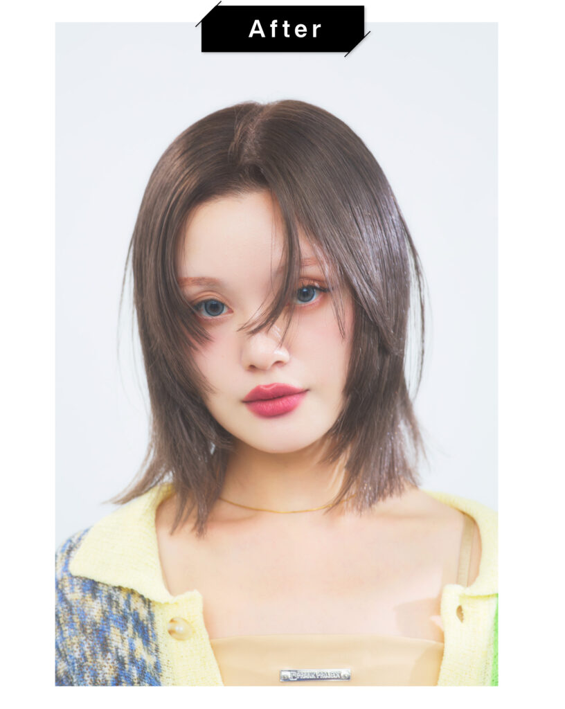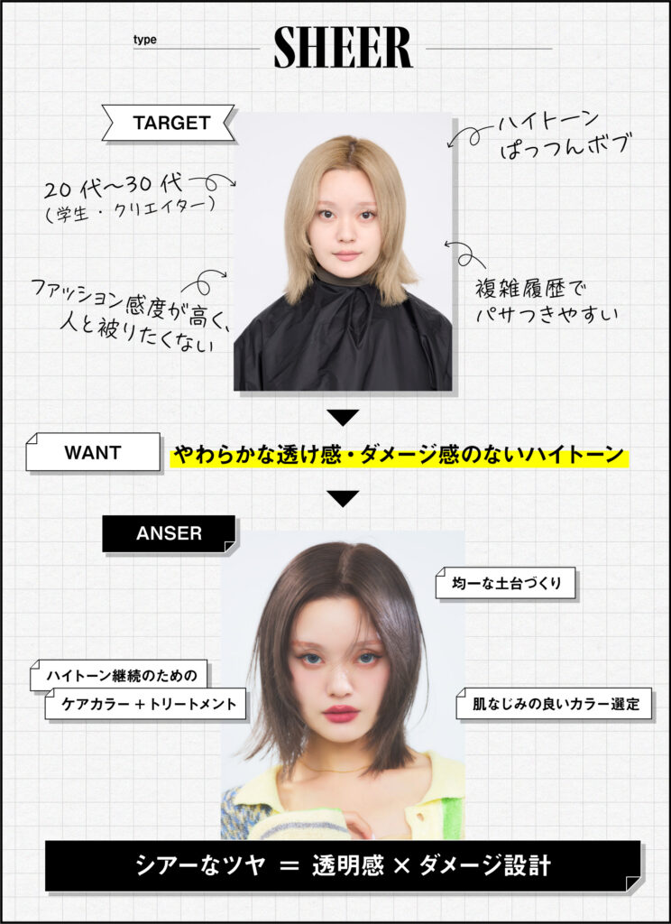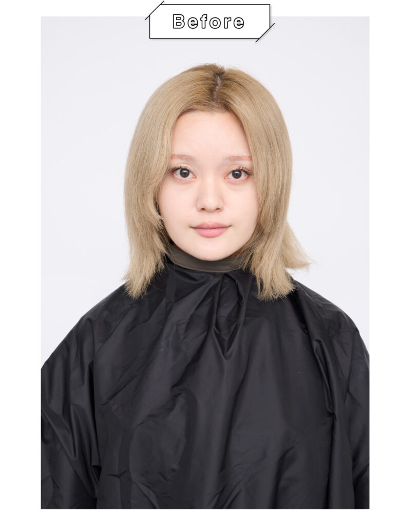 今回は均一なベースをつくるためのケア処理、そして透明感を感じるカラー選定しました。特にハイダメージの今回のモデルさんは普段しないカラーですが、肌なじみもよくうまく仕上がりました!