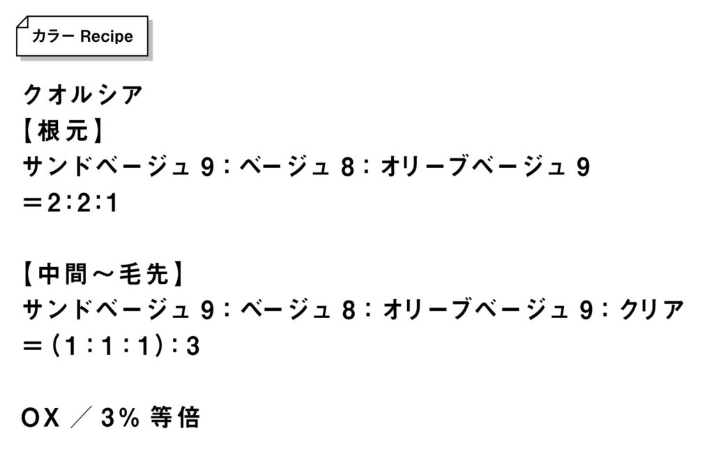 毛先に透明感を出すためにクリア剤を加え、抜け感をオリーブベージュで引き締めていきます!