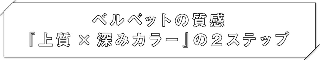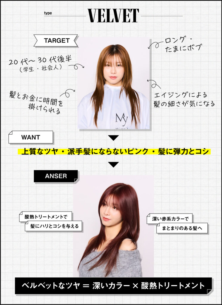 ベルベットなツヤは、柔らかい上質な手触りと奥行きのある深い光沢感がポイント。それらを演出するために、質感を酸熱トリートメントを使って質感を整え、カラーで深みを出します。