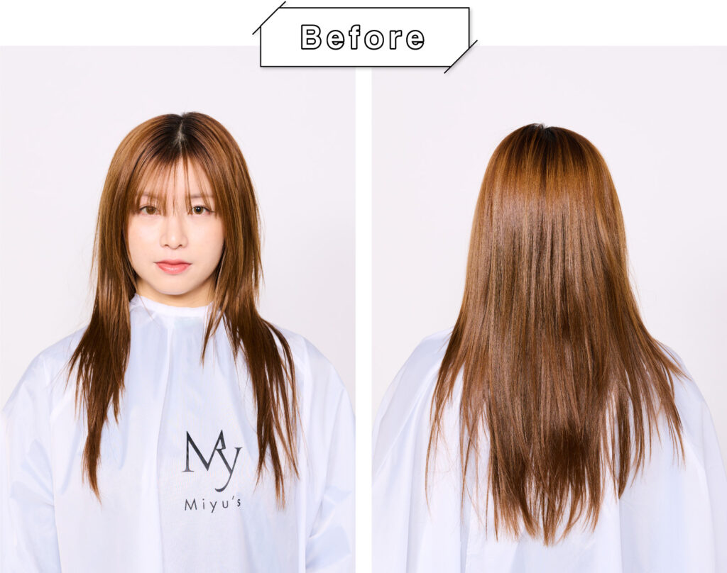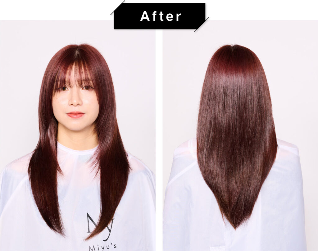 うねりや広がりを抑えた自然なストレートが完成。毛先までしっとりとまとまり、指通りも良い仕上がりとなりました。