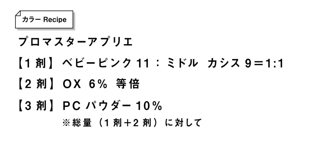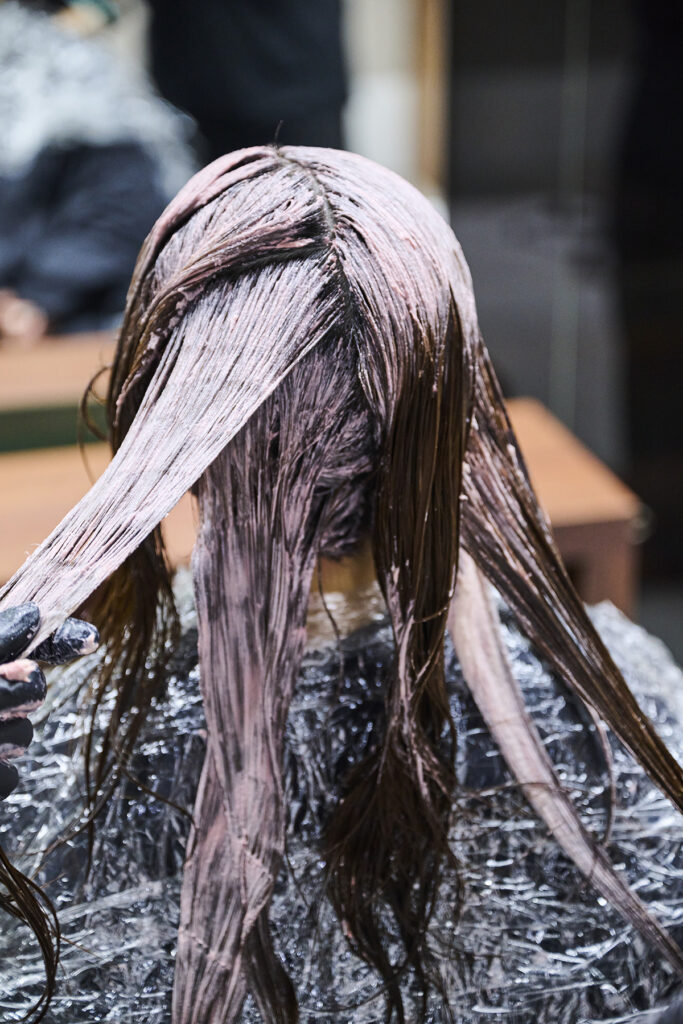 加温と2剤の塗布が終了し、続いてカラー剤の塗布。今回は、毎年秋に人気のピンクブラウン。甘いピンクの色味をブラウンで引き締めて、大人な印象へ仕上げていきます。暖色系の選択肢のひとつとして、赤みが強すぎると感じるお客さまの場合に提案しています。