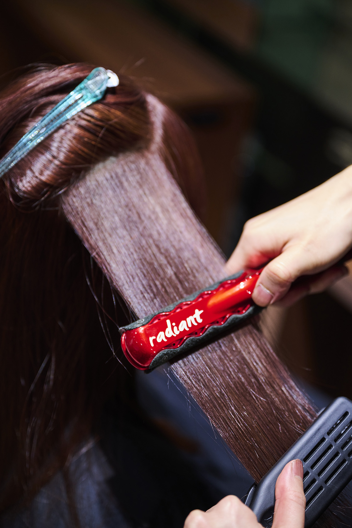 この時点で、ハリとコシが出ています。酸熱トリートメントの仕上げとなるアイロンワークは、熱を均等に通すことが最重要。コツは、プレートを髪に付けずに予熱で仕上げていくこと。ストレートブラシでテンションをかけながら、アイロンスルーします。
