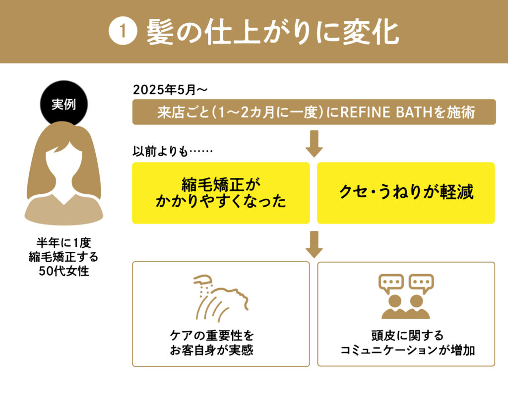 「売り上げなどの数字はもちろんですが、お客さまの髪の状態にも注目しています。縮毛矯正は施術を重ねるほど髪が傷むので、その間に行うトリートメントが重要だと心得てはいましたが、土台のケアでこんなに施術しやすくなるのかと僕自身も驚きました。定期的にリファインバスをされているお客さまは、クセが軽減されて、以前より縮毛矯正やストレートパーマがかかりやすくなっています」