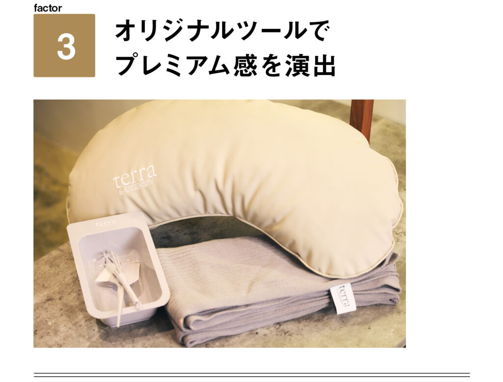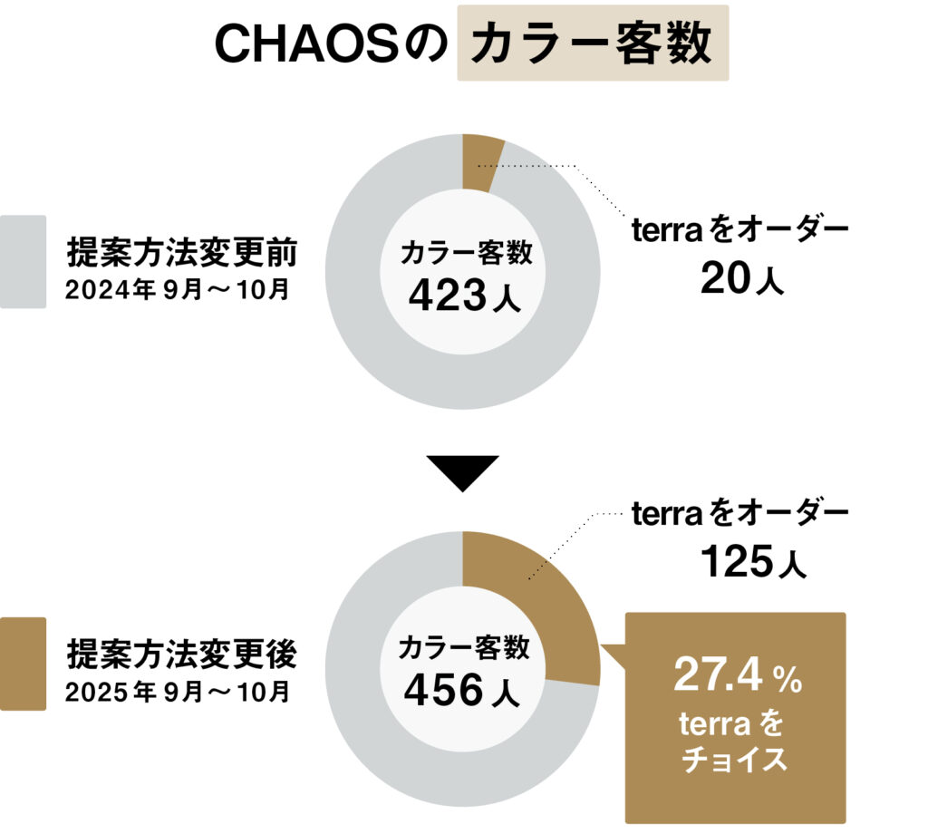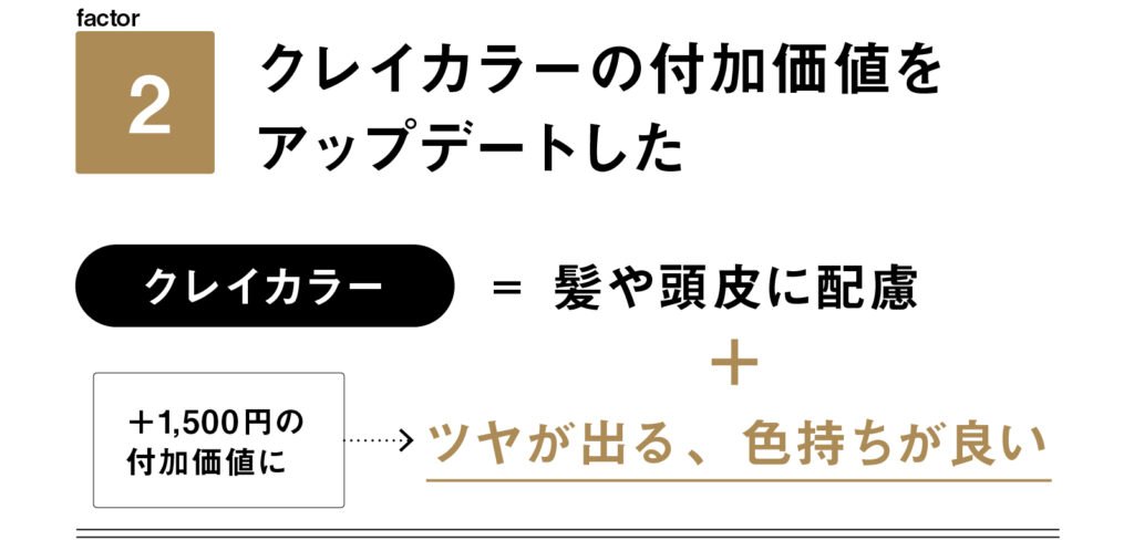 髪や頭皮に配慮していることがそれまでのterraのセールスポイントだったが、そこに「ツヤが出る」「色持ちが良い」という付加価値をプラス。1,500円の追加料金でもオーダーする顧客が急増した。