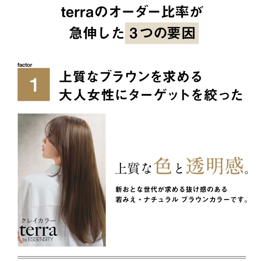 あらためてterraを試して実感したのが低明度でも濁らないツヤ感。色味が強いカラー剤は他にもあるが、透明感と発色のバランスが絶妙なため、「上質なブラウンを求める40代以上の大人女性」にターゲットを絞った。