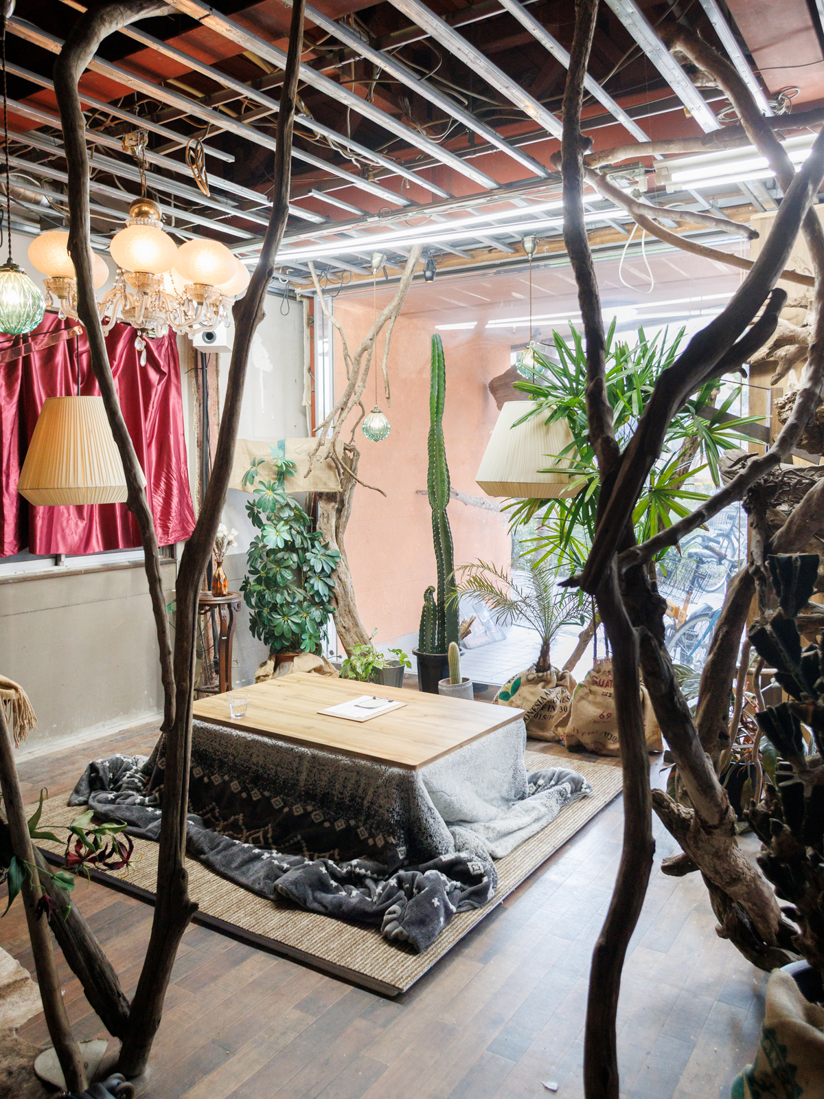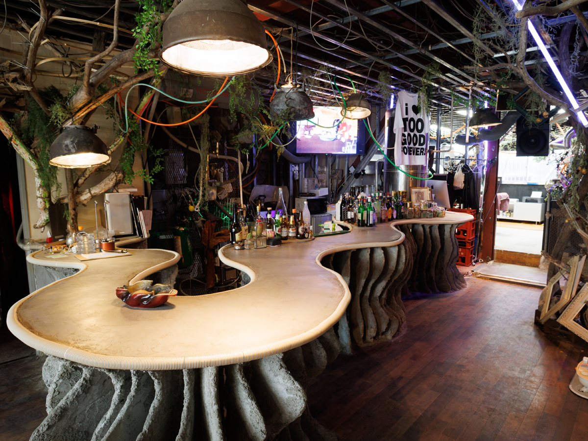 〈too good〉の1階にはバーとコタツが敷かれた空間、そして奥にタトゥーブースがある。ヘアサロンの気配はまったく感じられないフロアだ。