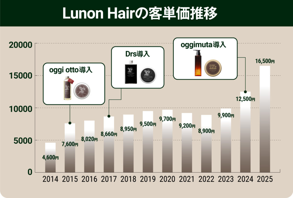 山々に囲まれ、隣は畑という立地にありながら、1万6,500円という高い客単価を実現している山梨県中巨摩郡の「ルノンヘア(Lunon Hair)」。下記のグラフからわかるように、同サロンはoggi otto(オッジィオット)とともに着実に単価アップの道を歩んできた。