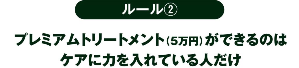 日々のホームケアにより価値を感じてもらうためのルール。たとえ希望があったとしても、責任をもって結果を約束できる髪の状態でなければプレミアムトリートメントは提供しないと決めている。