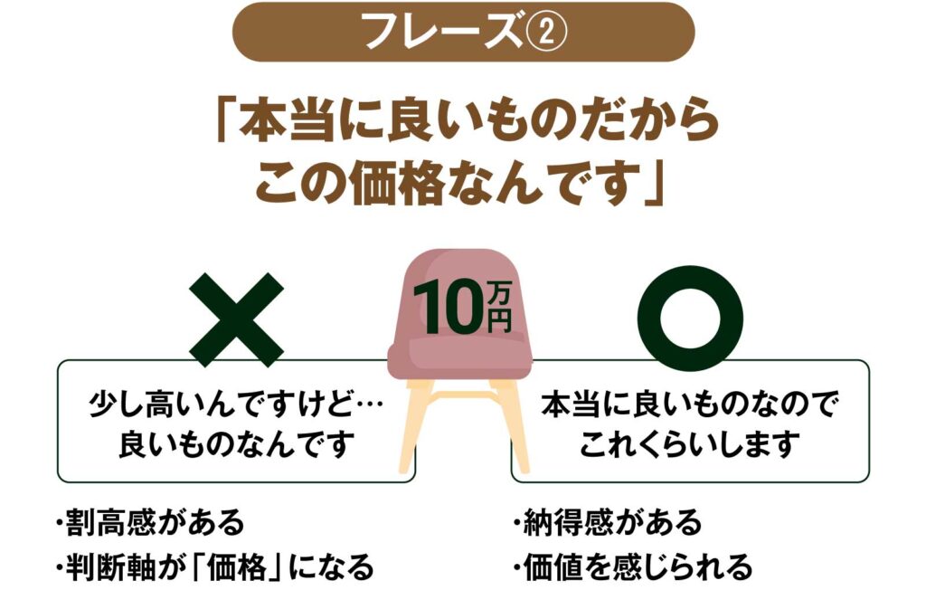 山本代表が実際に家具屋で体感し、取り入れているフレーズ。ラグジュアリーケアラインだからこそ、「価格」ではなく「価値」に軸を置き、自信を持って商品を紹介することが大切。